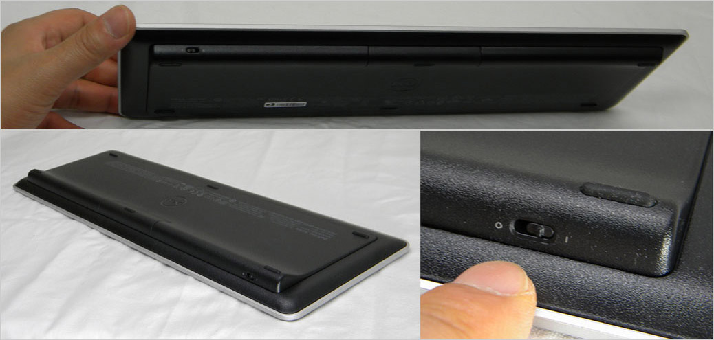 その隆起部分に電源スイッチ、単4電池×2のセット場所がある。ちなみに、当時、DELLサイトではKM714を「Tangerineワイヤレスキーボード」と言っていた。Tangerine (タンジェリン)は濃い橙色・赤橙色なので、たぶんUnifyingマークの色を指しているのでないだろうか。