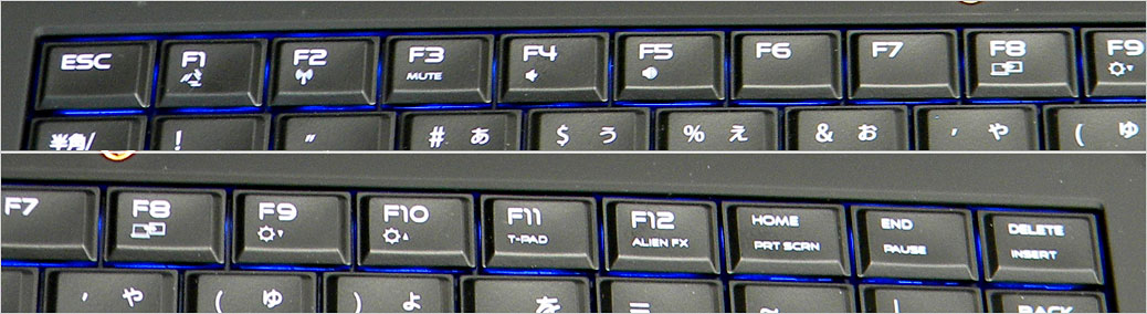 後は従来どおり、専用外付けGPU 「Alienware Graphics Amplifier」の切替ボタンがF1キーと兼用。ALIEN FX はF12キーと兼用になっている。