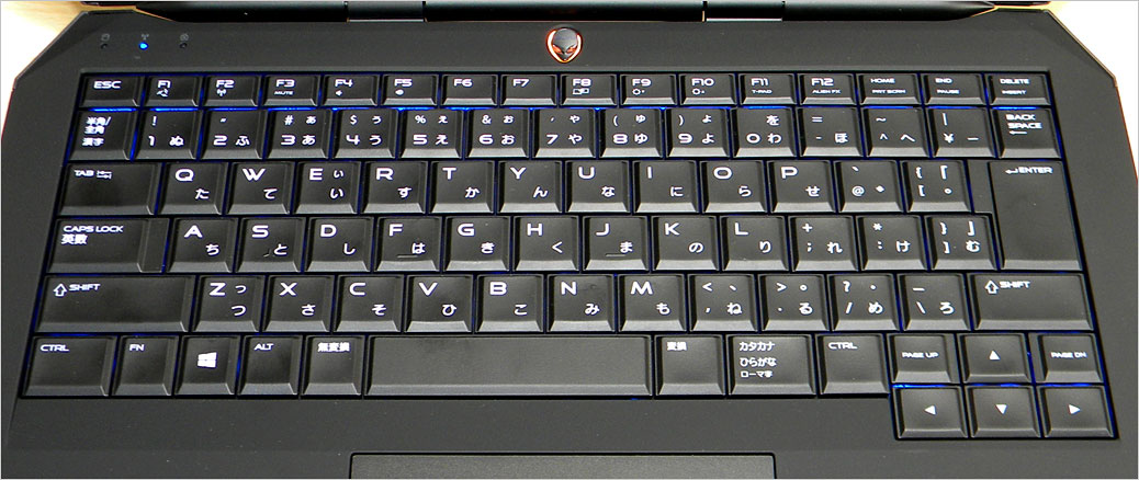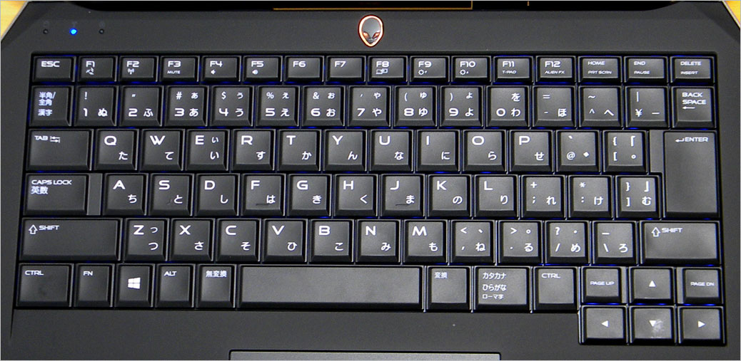 キーボードの型は前モデル(R2)を引き継いでいるが、印字の書体が変更されており細字になっている。そしてR2までは無かった「ALIENWARE独自のグラフィック切り替えボタン」が新たに追加されており、そのI/D GFXキーがF7と兼用になっている。I/D GFXキーは、常に単体GPUを使う「Perfoemance Mode」か、またはグラフィック自動切り替え(NVIDIAならOptimus任せ)の「Power-Saving Mode」に切り替えるボタンである。設定後は再起動が必要。