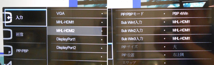 OSDでは、メインとなる入力先を指定する(写真左)。ここで指定したメイン信号は、PBPで画面を分けた時に必ずメインの位置に表示される。写真右は4分割にしたときの設定で、サブ1~3の位置に出力する信号を設定する。重複も可能だし、接続していない端子を選べば、そこはブラックになる。つまりブラックにできるのはサブ画面のみ。