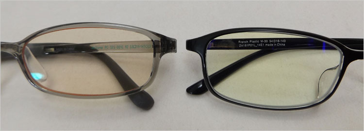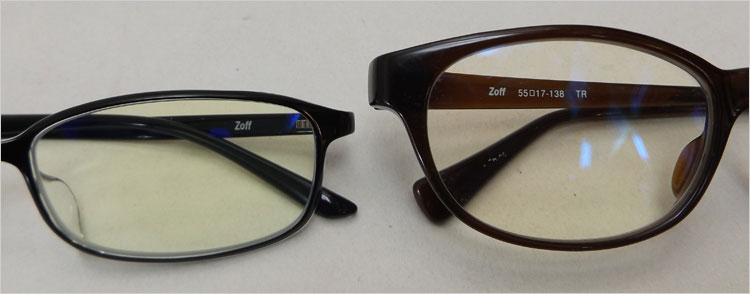 透過の様子。Zoffサイトでは「レンズは特殊なコーティング処理によりやや黄味がかりますが、透明に近い自然な見え方」と言っている。・・とはいうものの、やはり結構黄色く、可視光透過率95%とは言え、他のPCメガネよりも自然な見え方とは言い難い。「業界最高水準の透明度、過去に類を見ないほどの透明化」と言っているので、ここらがPCメガネの限界か。