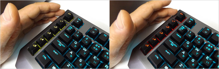 左端は5つのマクロキーを配置。ゲーミングキーボードに慣れていないユーザーは、この列の追加に最初は違和感を覚える。マクロ機能によりキー入力の動作を予め登録しておいて、次回からは登録キー(マクロキー)によって実行することができる。もっぱらゲームユーザーにメリットがあり、複雑なコマンド入力を省きキーひとつで的確に実行できる。