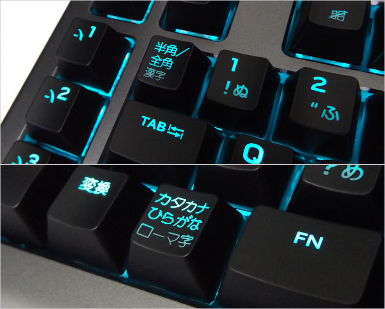 半角全角キーやカタカナひらがなキーでは印字の面積が広いため、光源が行き届いておらず若干まばらな状態。その他では概ね良好な発光である。