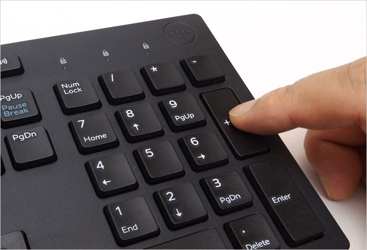 テンキーの上にDELLロゴ。「Num Lock、Caps Lock、Scroll Lock」の各ランプ