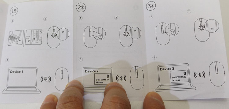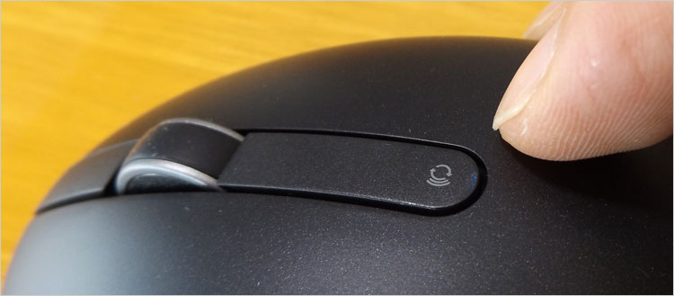 ワイヤレスの切り替えは、付属マニュアルに掲載。ボタンを押すごとに、DELLユニバーサル(1)、Bluetooth(2)、Bluetooth(3)と切り替わる。
