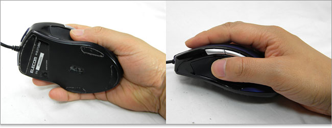 持った印象は、「ロジクール M500よりもごく僅かに大きい」と感じるくらい。「進む / 戻る」ボタンはM-BL07UBのほうが手前に寄っており、ベストポジション。