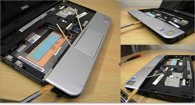 一般的なノートパソコンなら裏カバーを開いてメモリスロットにアクセスできるのですが、気軽にできないタイプもあります。DELL Inspiron Mini 10vではキーボードを取り外すところから始まります。