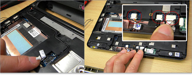 次はそこそこ難関である「パームレストの取り外し」です。 まず、タッチパッドケーブルを固定しているロックを2ヶ所外し、タッチパッドケーブルをシステム基板コネクタから取り外します。
