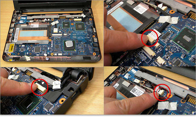 USB と SIM カードケーブルコネクタ を抜く。 AC アダプタケーブルコネクタ を抜く。 ディスプレイケーブルコネクタ を抜く。