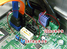 SATAコネクタSATAコネクタでは、SATA規格のHDDや光学ドライブをSATAケーブルで接続します。 USBコネクタ写真にある緑とうす紫のコネクタはUSBコネクタ。主に内蔵タイプのメディアカードスロットに接続、またはパソコン前面に装備するUSB端子用になります。エントリーパソコンでは、コネクタが割愛されて内部USBが減らされている場合があります。 |