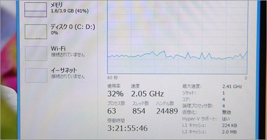 CPU使用率は32%あたりなので、そこそこゆとりを持って2D高精細コンテンツを処理できると判断できます。