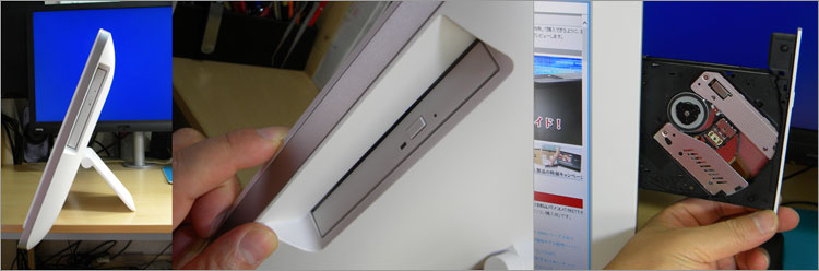 右側面にトレイ式のDVDスーパーマルチドライブを内蔵。