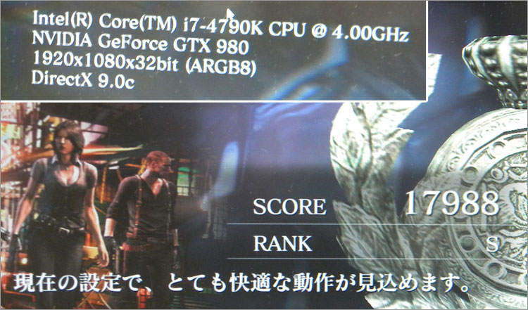 バイオハザード6 のフルHD解像度 (1920 × 1080)設定で、スコア17988。むろんとても快適な動作。