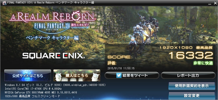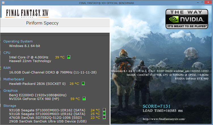 なお、旧ファイナルファンタジーXIV のベンチマークテストで発熱温度を調査。室温20度の環境下でテスト直後では、Core i7-4790Kが39℃、GeForce GTX 980が59℃と出ました。CPUに関しては水冷の効果が大きいと感じられます。