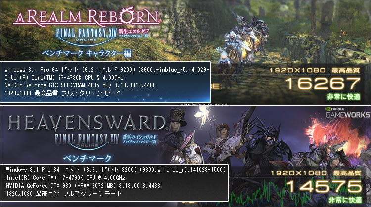 ファイナルファンタジーXIV 新生エオルゼアおよび、 蒼天のイシュガルドでは、フルHD(1920 × 1080)最高品質フルスクリーンでチェックしましたが、いずれも「非常に快適」でした。