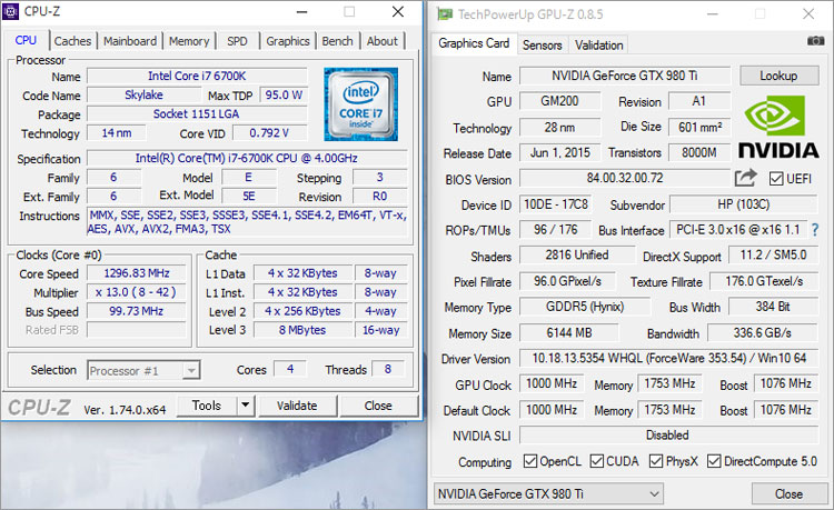 インテル Core i7-6700K および、NVIDIA GeForce GTX 980Ti のスペック詳細。