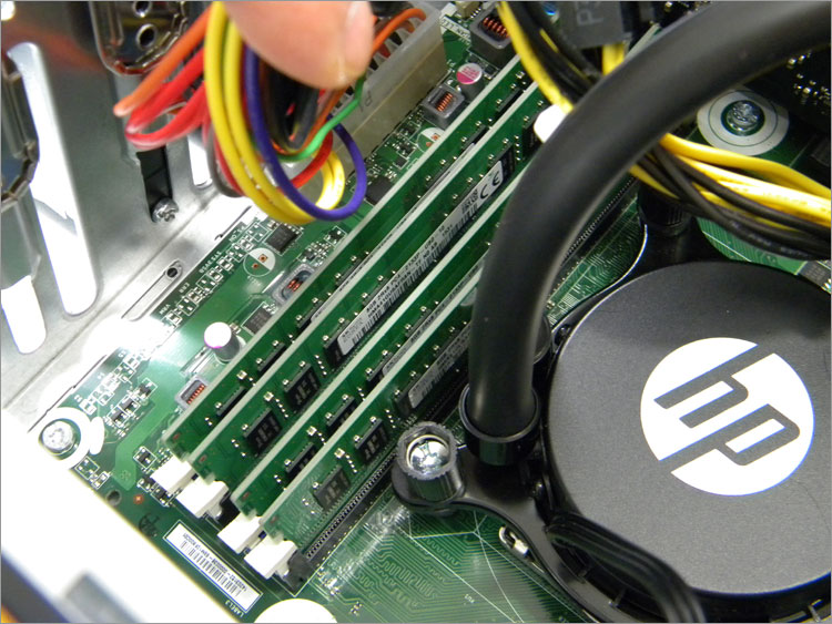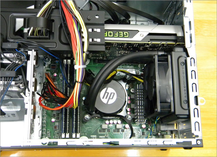 今回の構成におけるENVY 750-180jpの内部構造。PCケースは同じだが、前モデルENVY 750-080jp(第4世代Core)からテンクロジーが一新しており、Skylake設計になっている。つまり第5世代Coreをスキップしていきなり第6世代Coreへ。MicroATXマザーボードが逆倒立配置されており、CPUが一番下に置かれている。