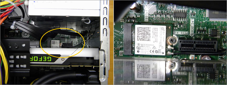 使えるPCI Expressスロットは、PCI Express × 1が1スロット。その後ろにオプションの無線LANカード(IEEE802.11a/b/g/n/ac 、 Bluetooth 4.0)が搭載できる。また、グラフィックカードの下に、M.2 x 2スロットが隠れている。