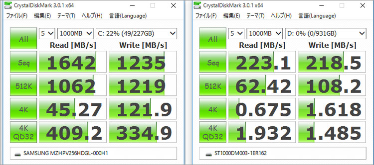 今回、ストレージ構成は、「256GB SSD (PCI Express, M.2接続) + 1TB HDD (SATA, 7200回転) × 2台」だが、PCI Express, M.2接続のSSDがとんでもなく爆速だった。※SSDとHDDの採用製品は画像に記載しておいたが、供給状況で採用されるベンダーは異なると思われる。あくまでこの実機における調査。