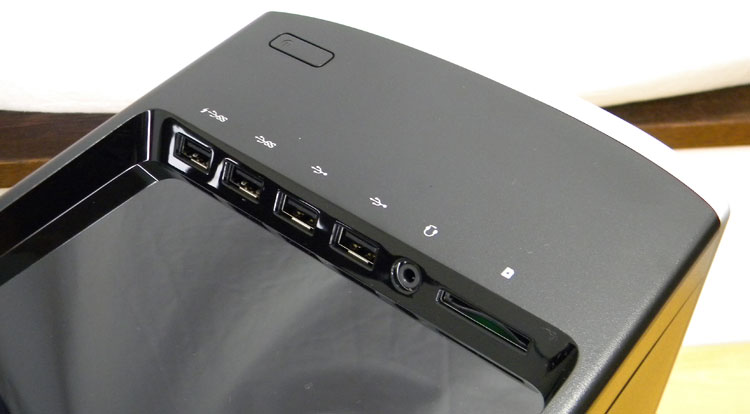 アルミのフロントパネルがある前面には端子を装備しておらず、光学ドライブがあるのみ。天井面に「USB3.0端子×2基、USB2.0端子×2基、ヘッドセット端子、SDカードスロット」を配置する。