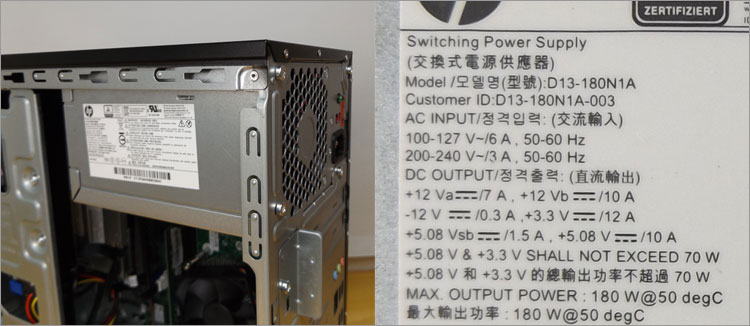 Pavilion 510-p100jpで搭載しているATX電源ユニットでは容量が180W。+12Vが2系統あり、それぞれ最大7Aと10A。完全にローエンド仕様なので、内蔵グラフィック仕様で十分な初心者向き。CPUも低消費電力のTシリーズが採用されていることに合点がいく。