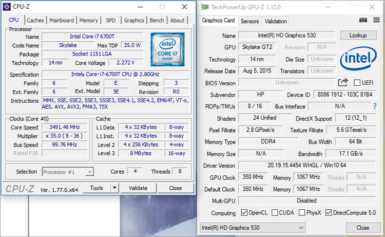 Core i7-6700Tのスペック詳細。4コア実装でHTテクノロジーによって8スレッド動作する。低消費電力タイプのTシリーズなので、TDP35Wと通常版よりやや低消費電力。Core i7-6700Tに内蔵(厳密には統合)されているグラフィックは、インテル HD グラフィックス530。