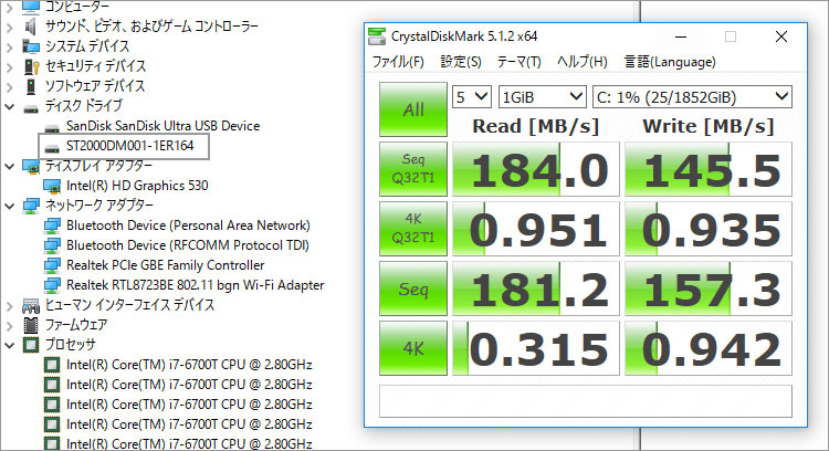 搭載されていた3.5インチHDDのパフォーマンス。ちなみにシーゲート製(ST2000DM001)だった。