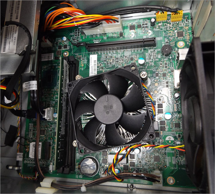 Pavilion 510-p100jpで搭載されているマザーボード。PCI Express x16 スロットが1基、メモリスロットが2基。従来のミニタワーと比べると著しく拡張性がなくなっているが、その分コンパクトにもなっている。また、スリム型パソコンに「標準サイズの拡張カードが搭載できるようになったようなもの」と言える。