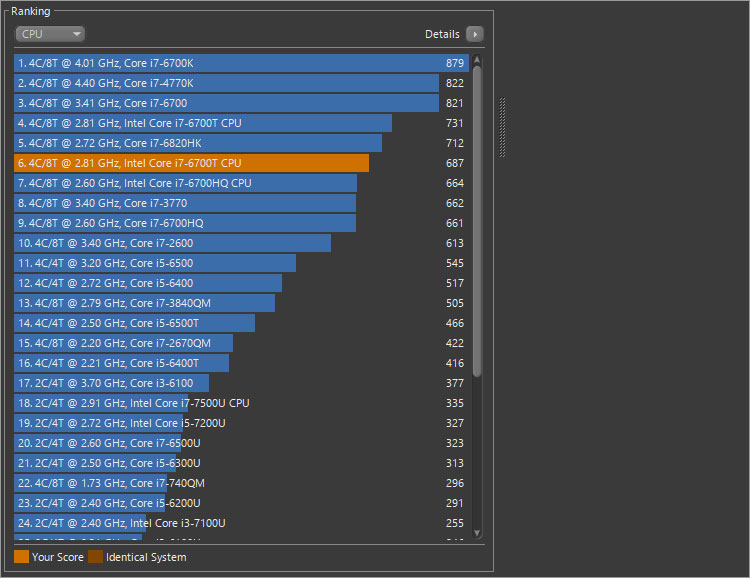 CPU性能の比較として、CINEBENCH R15のレンダリングを測定。Pavilion 510-p100jpに搭載したCore i7-6700Tのスコアは「687」だが、他PCのケースで比較すると、環境次第でもう少しスコアが伸びそう。どうやらCore i7-2600よりは処理能力が高いようだ。通常版のCore i7-6700とは明らかに差をつけられていることが分かる。