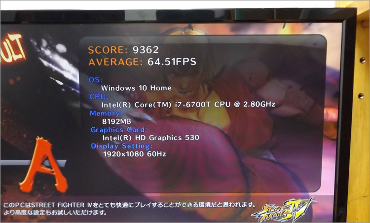 グラフィックカードなしの内蔵グラフィックと言っても、ストリートファイター4(品質デフォルト)がフルHD(1920 × 1080)で、快適にプレイできる性能を誇る。