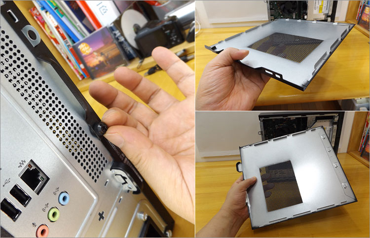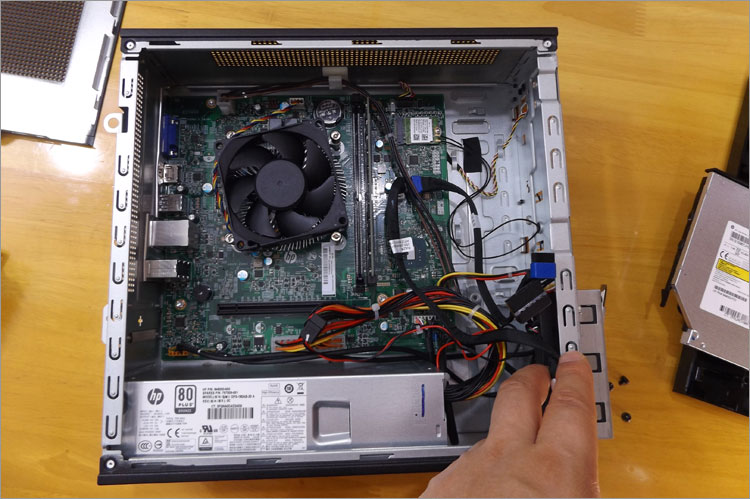 これはSlimline 260-p000jpの内部。底面に電源ユニットを配置している。前モデルでは前面の下部に吸気ファンが配置されていたが、Slimline 260のPCケースにはない。ここではSlimline 260のドライブマウンタをチェックする。