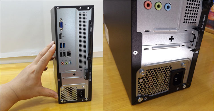 背面では、装備端子、通気口、PCI Express x16が1スロット、そして底部に電源が配置されている。