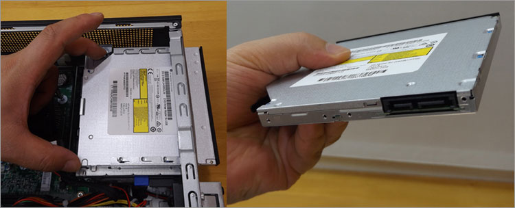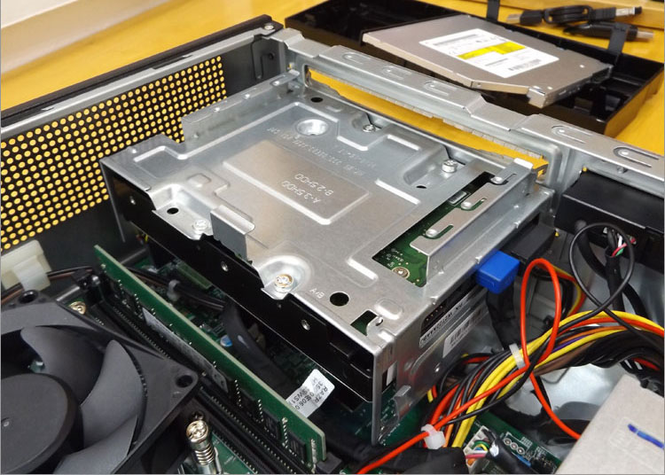 DVDのスリムドライブと3.5インチHDDの兼用マウンタとなっている。各一台までであり、増設はできない。