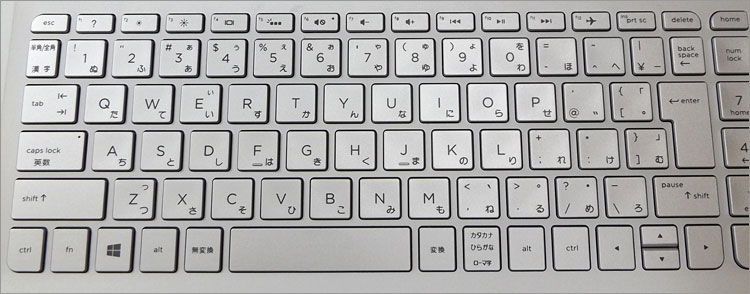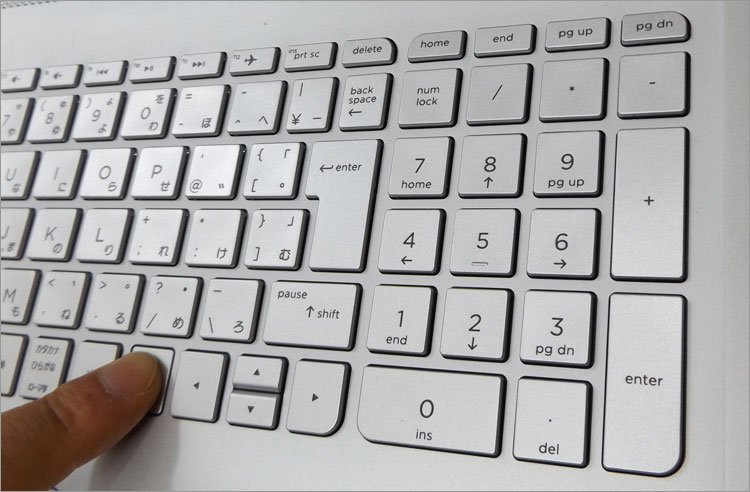 15.6インチノートにテンキー付きなので、部分的に小さいキーが生じる。半角全角キーは端にあるのでいいとして、BackSpaceキーが囲まれており、やや扱いにくさがある。hp製品全般に言えることだが、ファンクションキーの印字が小さすぎるため、位置は体で覚える要素が強い。