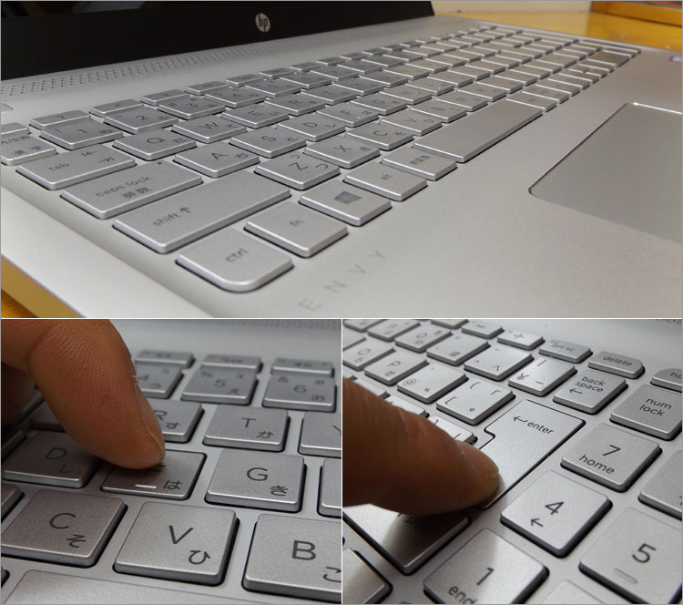 ENVY 15-as100はかなり薄型ボディであるが、そこそこのキーストロークは確保している。キートップはほとんどフラットで、滑らすようなタイピングに向いている。