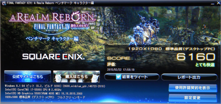 1920×1080 標準品質(デスクトップPC)フルスクリーンモードで、「とても快適」。インテル HD グラフィックス 5500の表示になっていますが、GeForce GTX 850Mで動いているはず。(一応任意設定したし)