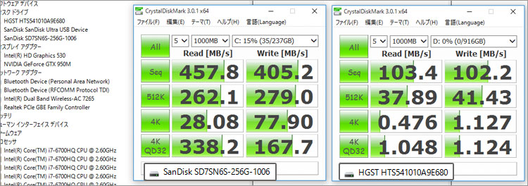 前モデルのときと同じく、256GB SSD (SATA M.2接続) + 1TB HDD (5400回転)の構成でチェック。SATA 接続とはいえ、SSDはアクセス速度が速い。シーケンシャルではHDDの4倍近く。レビュー本機では、SANDISK製のSSD、HGST製のHDDが採用されていたが、供給状況でパーツのベンダーは異なる。