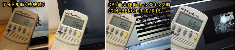 アイドル時ではディスプレイ輝度MAXで12W、輝度最小で6Wまで下がった。CPU最大稼働時のレンダリングでは、62~65Wくらい。