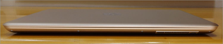 カラーバリエーションは2色あり、今回レビューしているPavilion 15-AU000ではモダンゴールド。他にはブリザードホワイトもある。スタンダードモデルなので、質感はポリカーボネート(工業プラスチック)であるが、ペイントカラーでリッチ風のデザインに仕上げてある。中央にはミラー調のhpロゴを配置している。