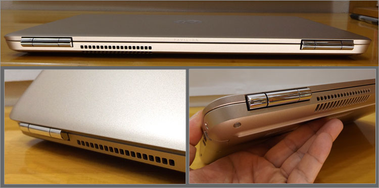 底面もモダンゴールドのペイント。上品カラーに抜かりはないようだ。排気口を後背部に配置することで、熱風をユーザーから遠ざけた設計になっている。ただ、低消費電力の第6世代Core-Uシリーズ搭載機であるため、もともと大掛かりな冷却システムを必要としていない。