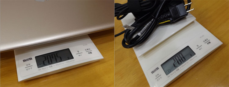 公称の質量は約 2.14kg であるが、Core i3-6100Uを搭載したこのレビュー実機では2.075kgであった。45W ACアダプタは電源ケーブルを含め288g。据え置き用メインであるが、モバイルにしてもさほど無理のない重量であろう。
