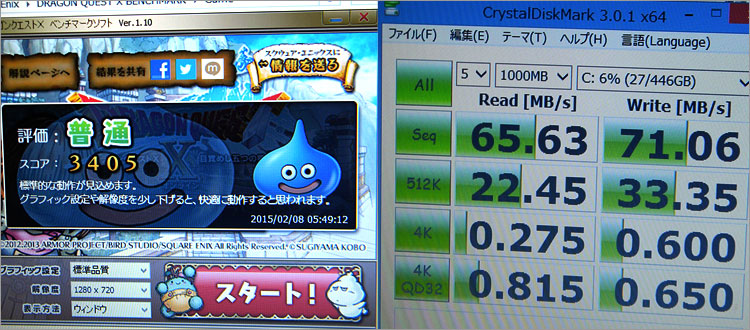 その他、ベンチマークテストの結果。ドラクエではHD解像度で普通(3405)のスコアでした。
