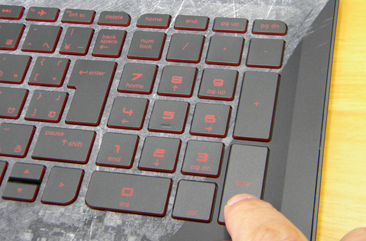 キー配列をチェック。テンキーを装備しているので、ホームポジションはやや左寄りになる。プリント面はさらっとしており、ベタついた印象はない。