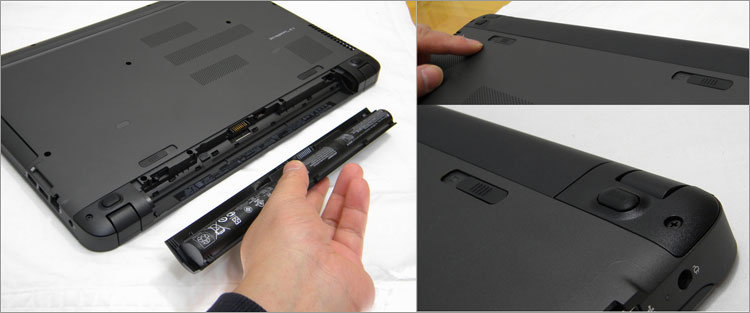 着脱可能な4セルバッテリ。公称では約 7時間のバッテリー駆動時間。