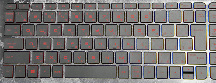 15.6インチノートのテンキーがあるため、一部のキーは小さくなっている。例えば「半角全角キー、¥、BackSpaceキー」はやや小さい。カーソルキーでは、特に上下キーが小さいのがやや気になる。なお、キーボードバックライトを点灯させないと、印字は読みにくい。