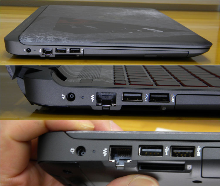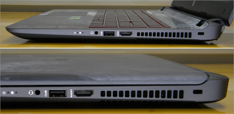 電源とHDDライト、ヘッドセット端子、USB3.0端子×1基、HDMI端子、排気口、セキュリティロック・スロットを右側面に配置。