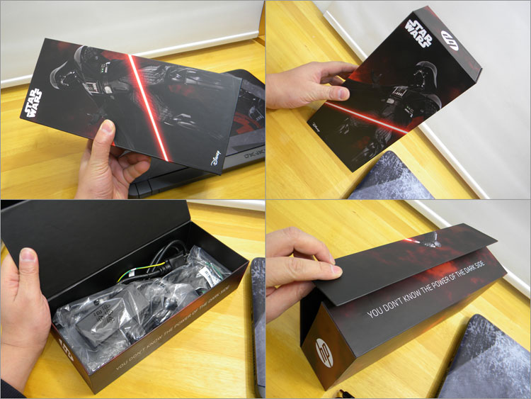 梱包箱は、新敵のカイロ・レンがパッケージになっている。PC天板のプリントはダースベイダーなのに、ここはちょっと誤解を招きそう。コラボのワイヤレスマウスとスリーブケースでは「Star Wars™ Special Edition Notebook コンプリートモデル」の場合はセット販売だが、通常は単体のオプション販売だ。ほかのHPパソコンと