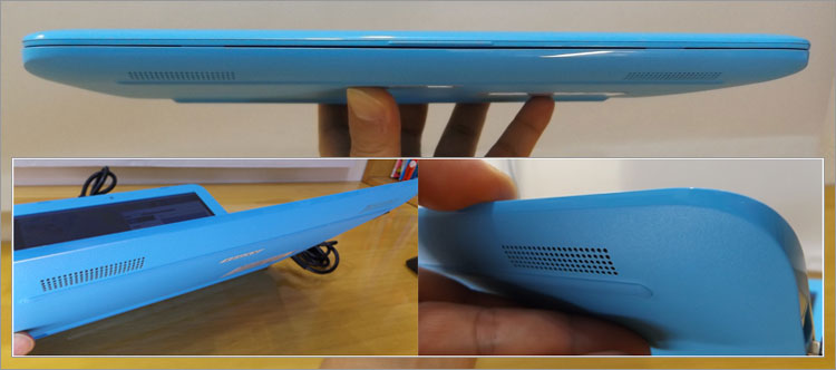 Stream 11-y000は、ディスプレイ、底面、ゴム足に至るまで 「アクアブルー」で統一されたポップなカラーで、どちらかというと女性好みにデザインされている。質感はポリカーボネート(工業プラスチック)ベースのため、これといった高級感を持たせる要素はない。これは価格からして折り込み済みだろう。