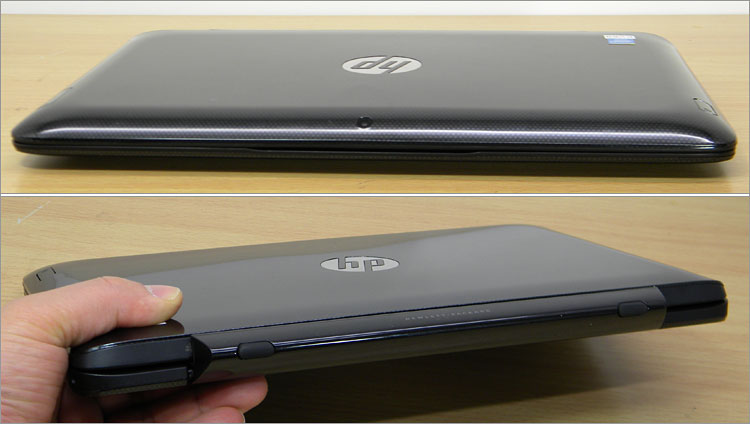天板、つまりタブレットPCの裏面となりますが、この写真のHP Pavilion11 x2はスパークリングブラックというカラーです。この天板には斑点状のデザインがプリントされており、HP Imprintにより傷がつにくい加工がされています。