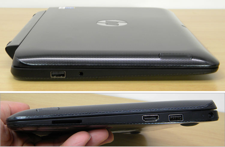 左側面にUSB2.0端子 × 1基、ヘッドセット端子 × 1基を装備。右側面にSDカードスロット、HDMI、USB3.0端子 × 1基、、電源コネクタを装備しています。USB端子の数はミニノートとしては最低限といった様子。